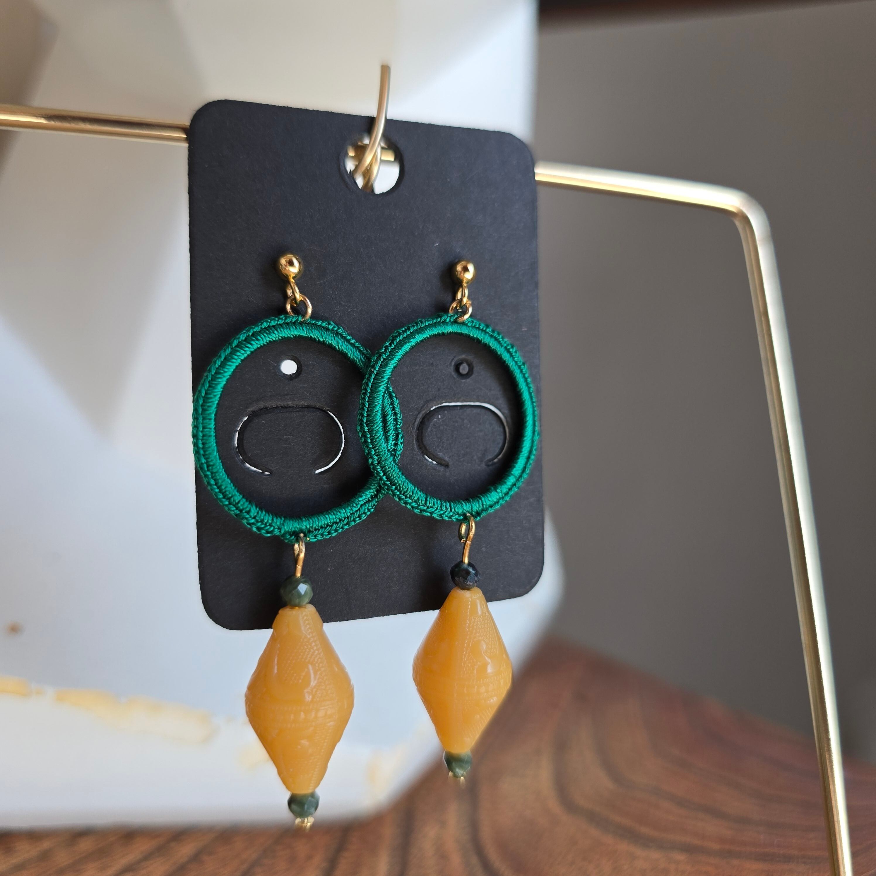 深いグリーンの糸とビーズが揺れる。