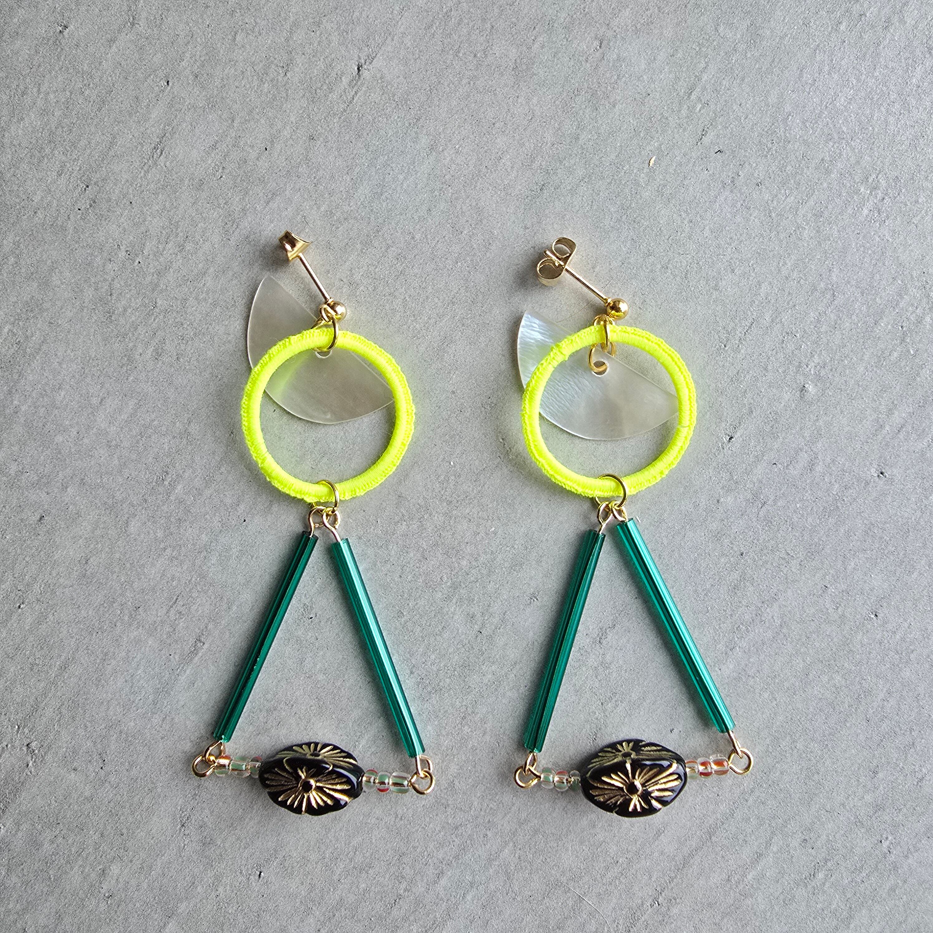 ビビットなイエローと半円のシェル(貝殻)が揺れる。