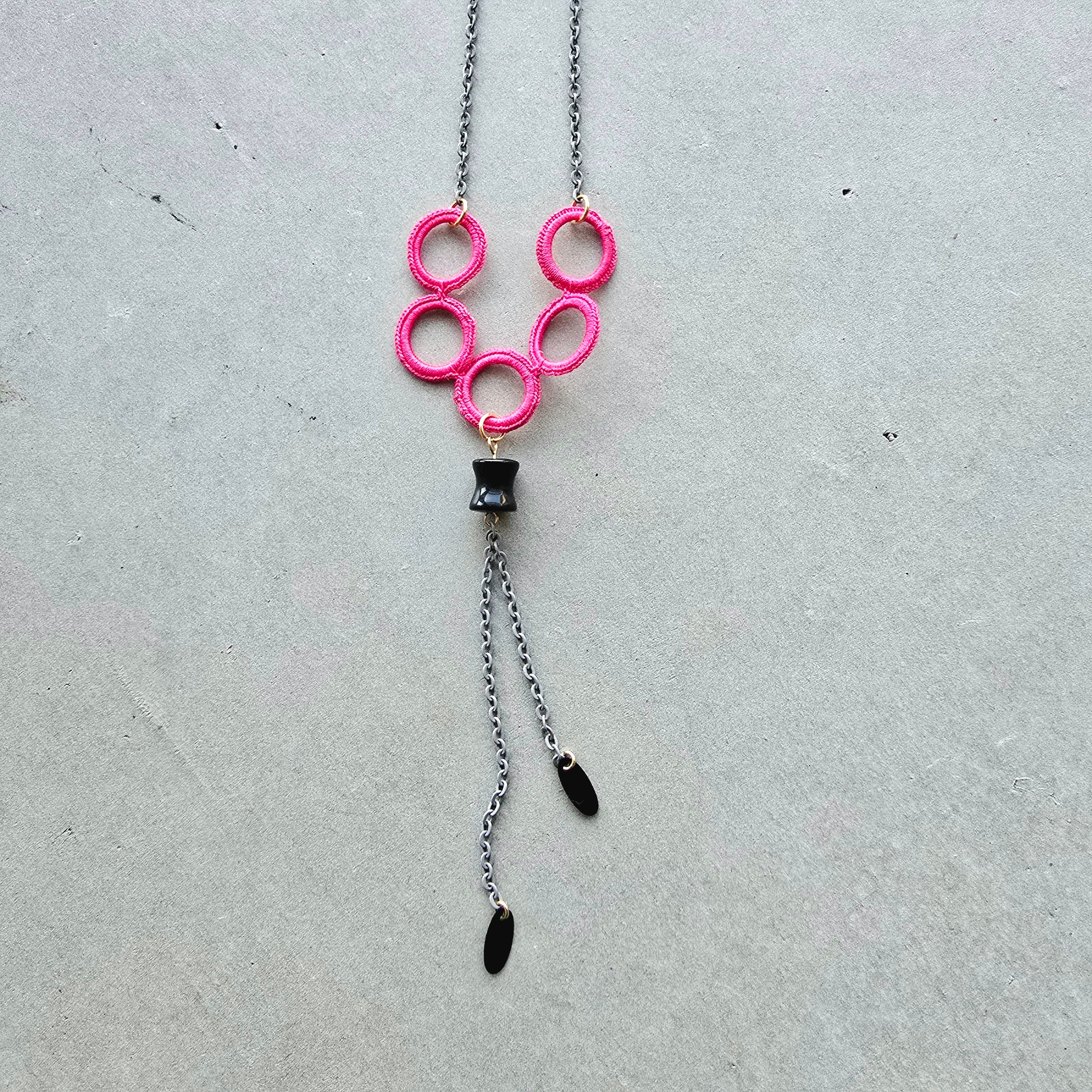 色とりどりな糸を編み込んだ輪っかと、ひとつひとつ表情の違うビーズが揺れるたびに目を引きます。