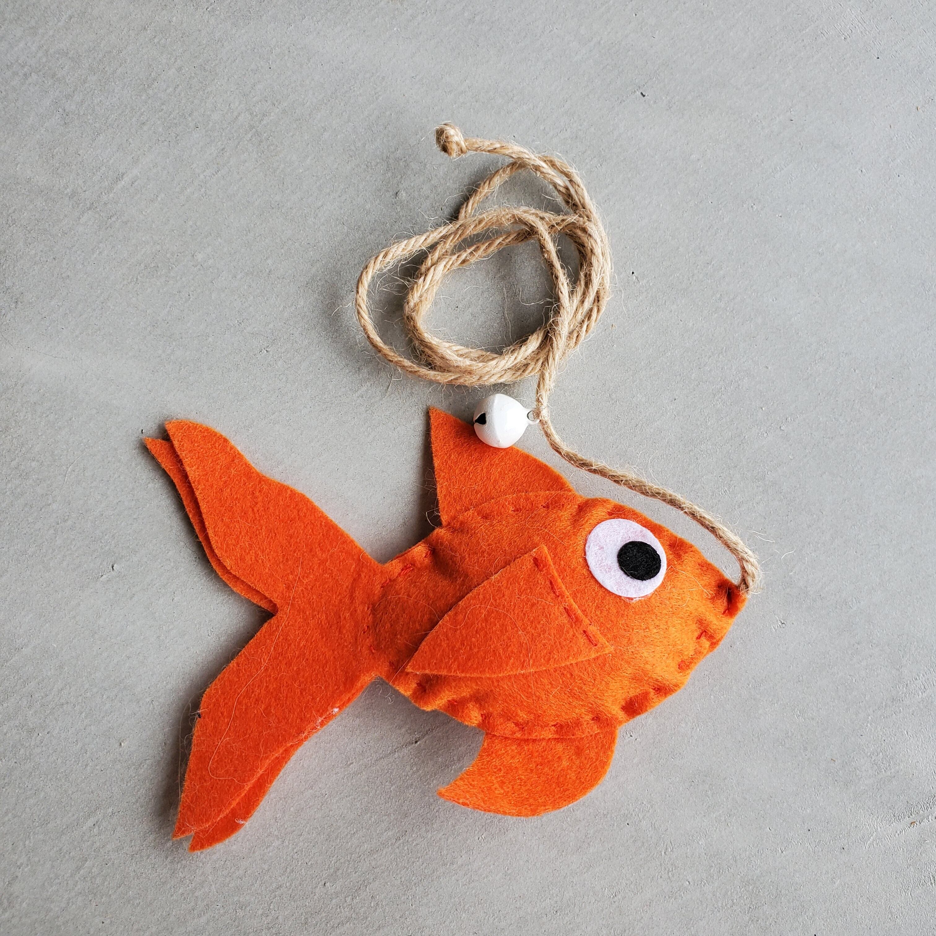 イギリス在住作家さんの手作り。 金魚型の猫じゃらしです。 鈴がついていて、よく遊びます。 素材:フェルト 全長:13cm 紐の長さ:73cm