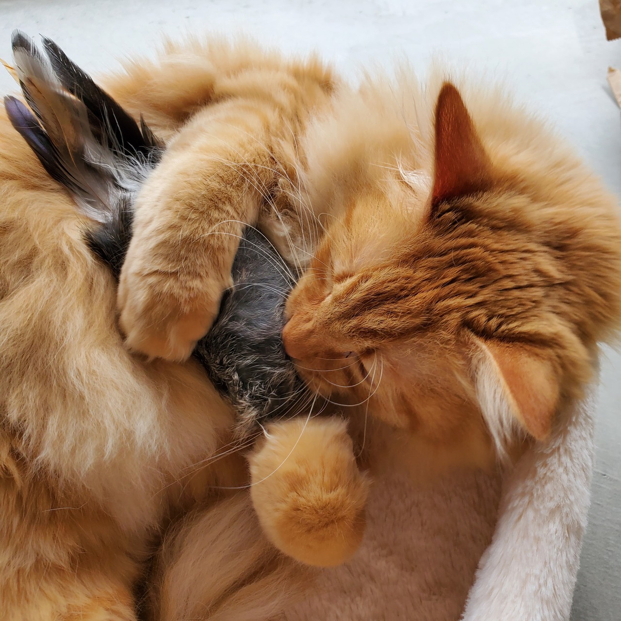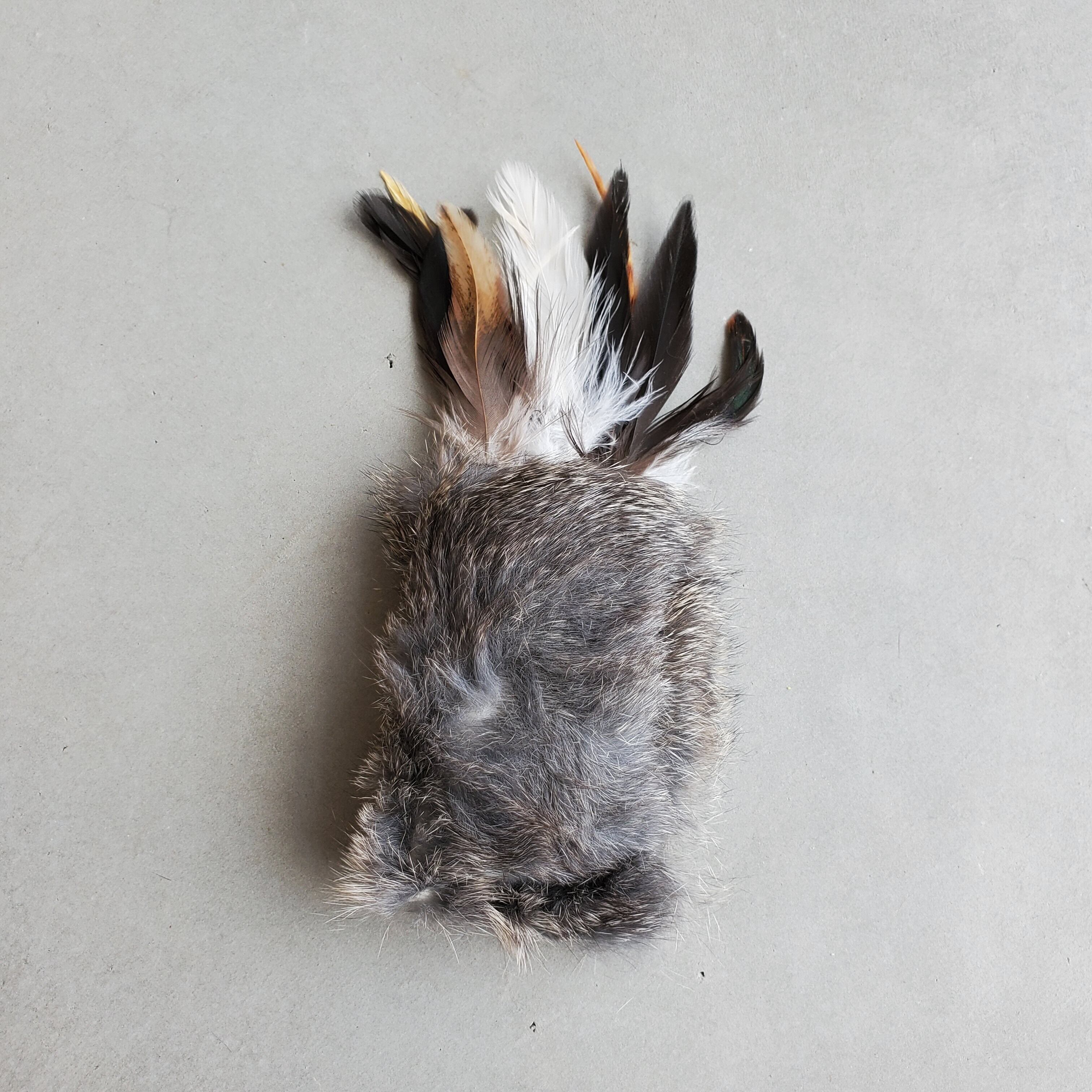 ラビットファーとフェザーを使用した猫のおもちゃ。